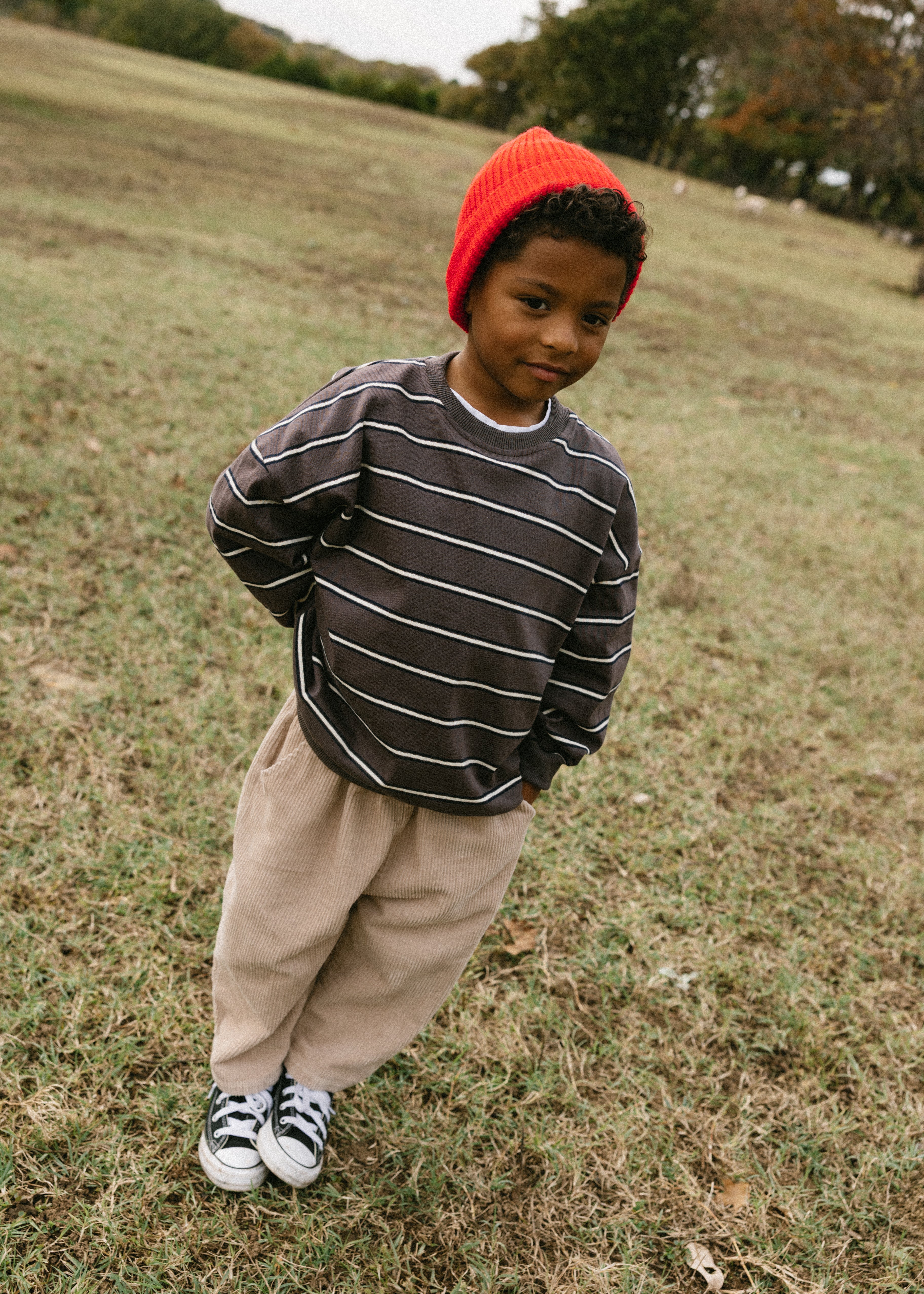 • Smoky brown sweater with navy and cream stripes