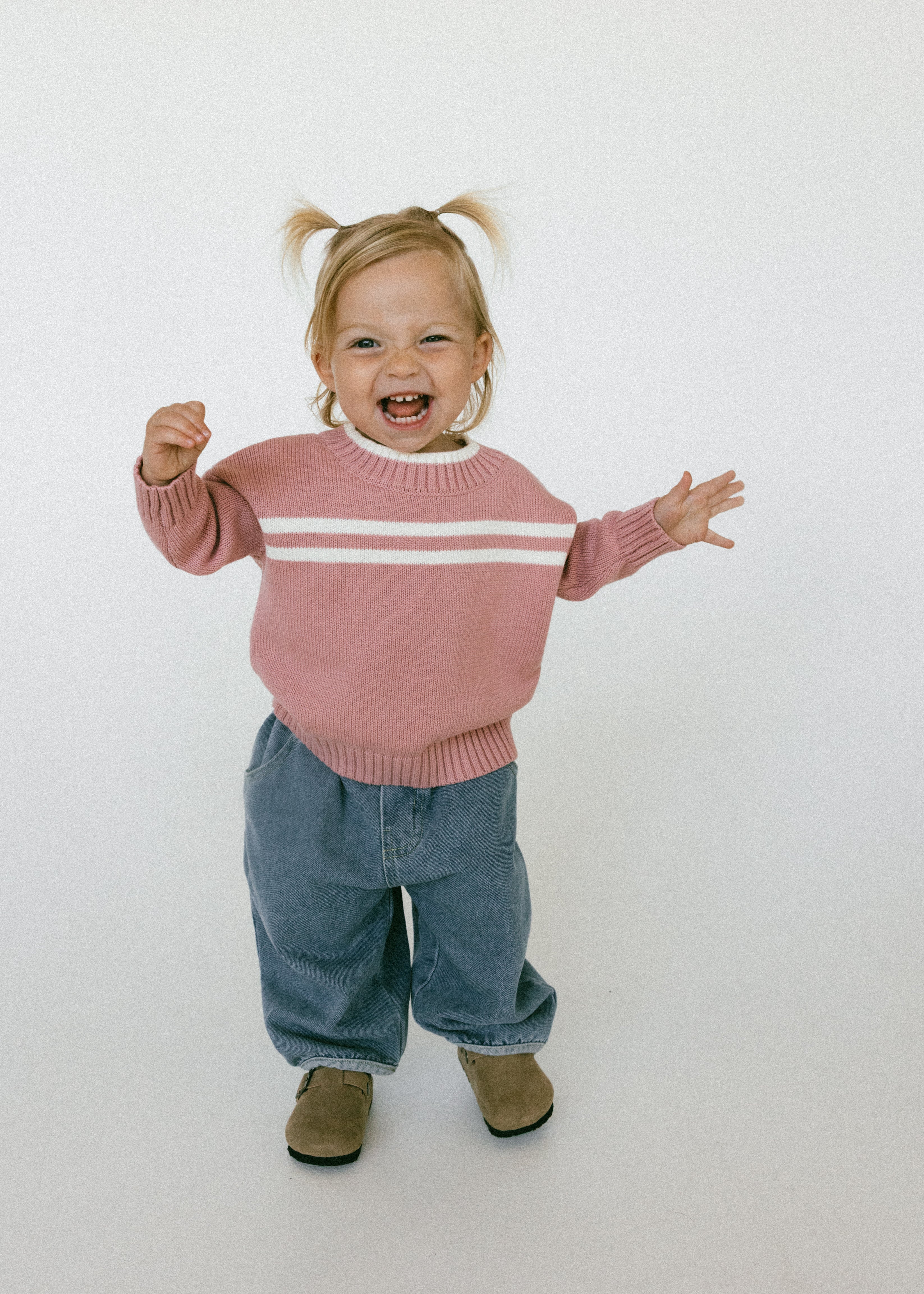 • Rose pink knitted cotton crewneck with white double stripes across the chest