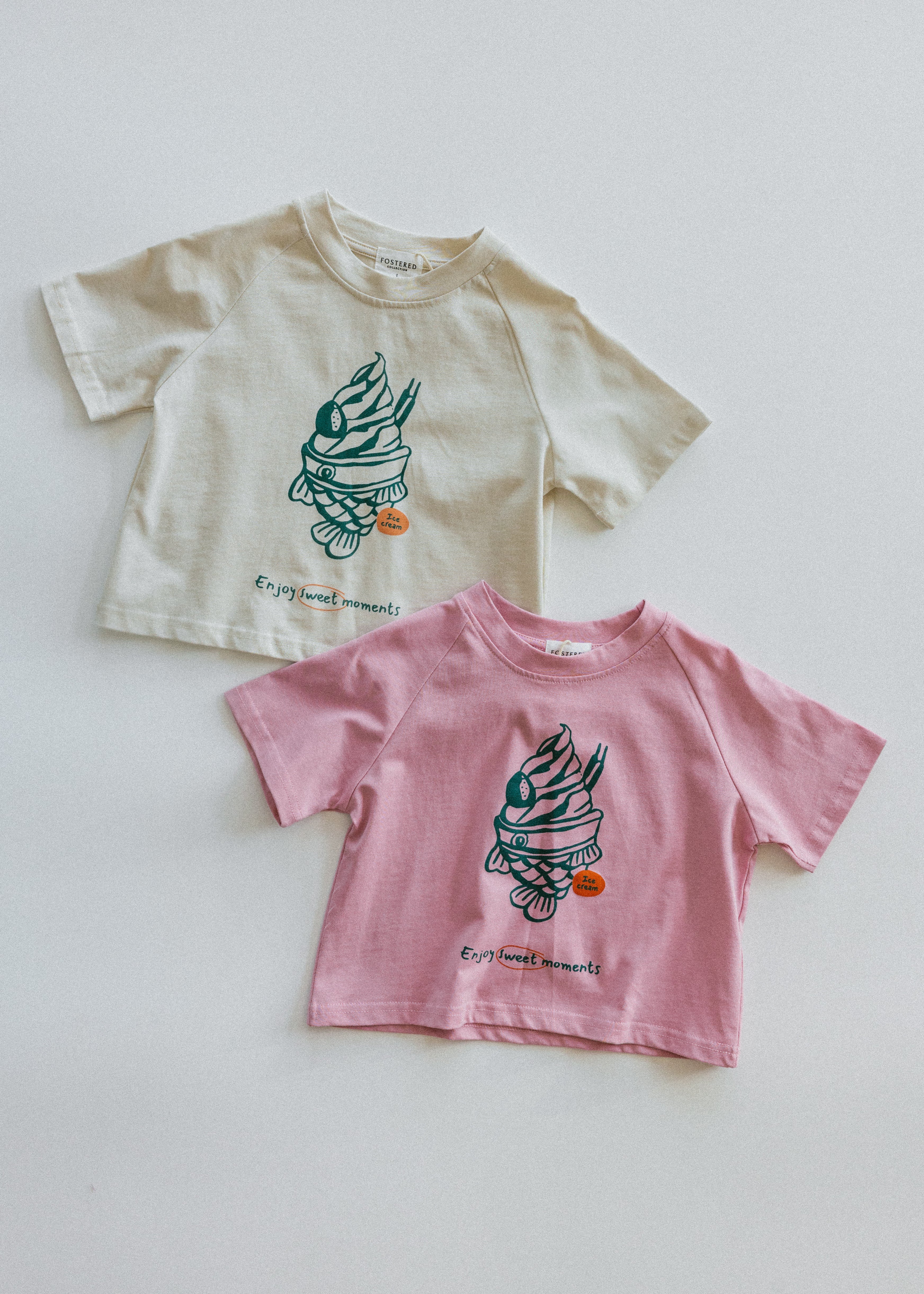 • Taiyaki (fish-shaped cone) ice cream graphic with "Enjoy sweet moments" lettering