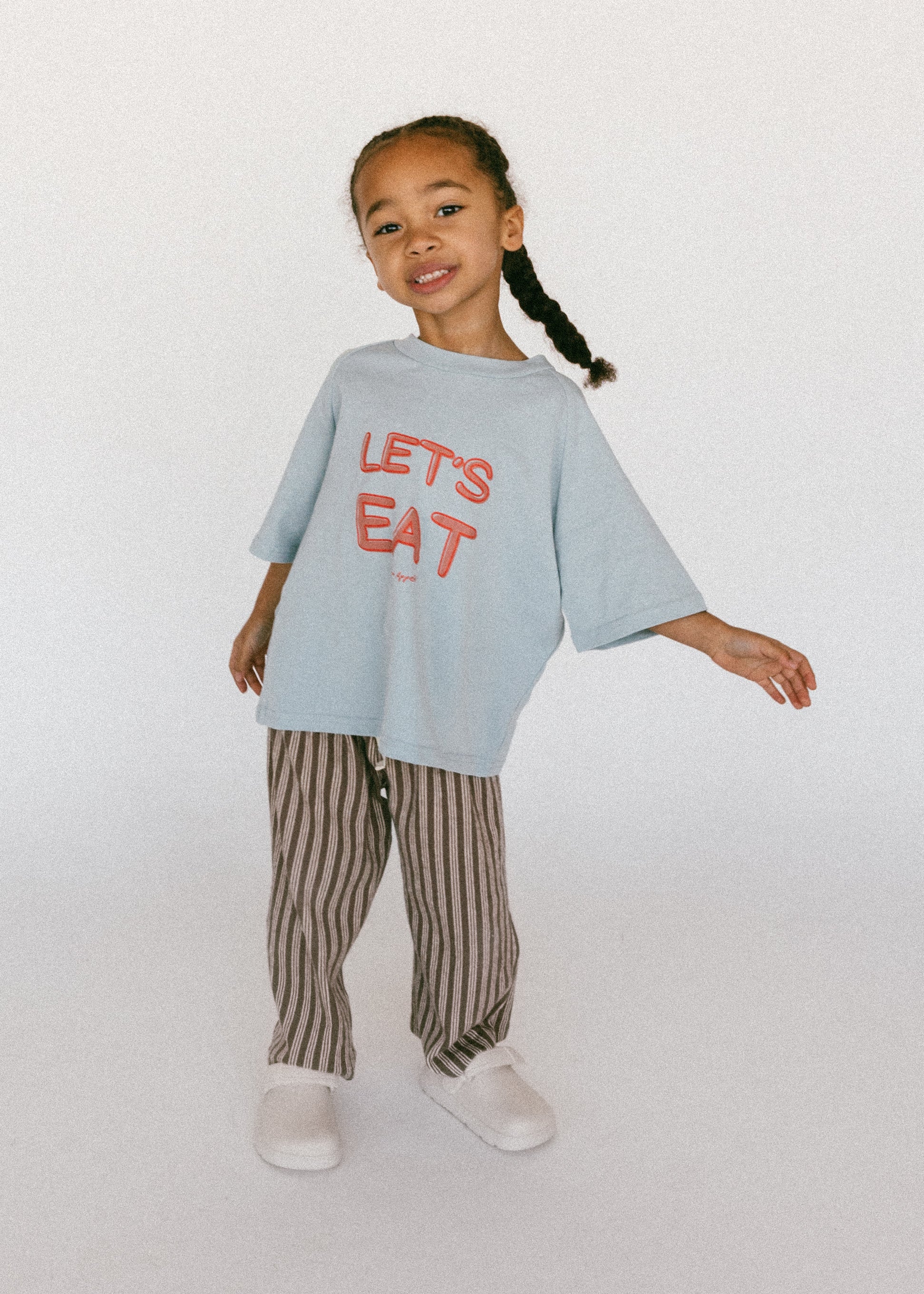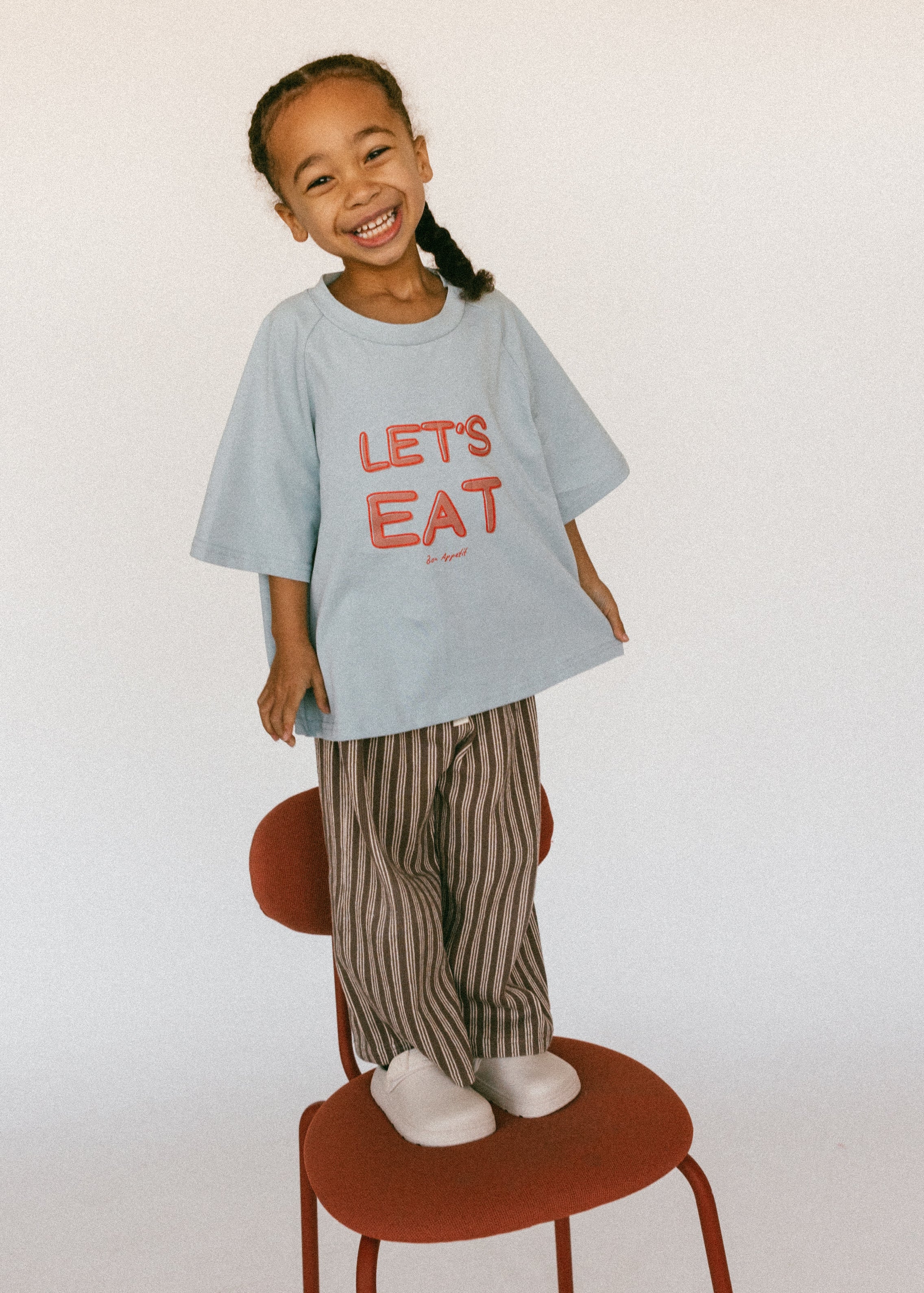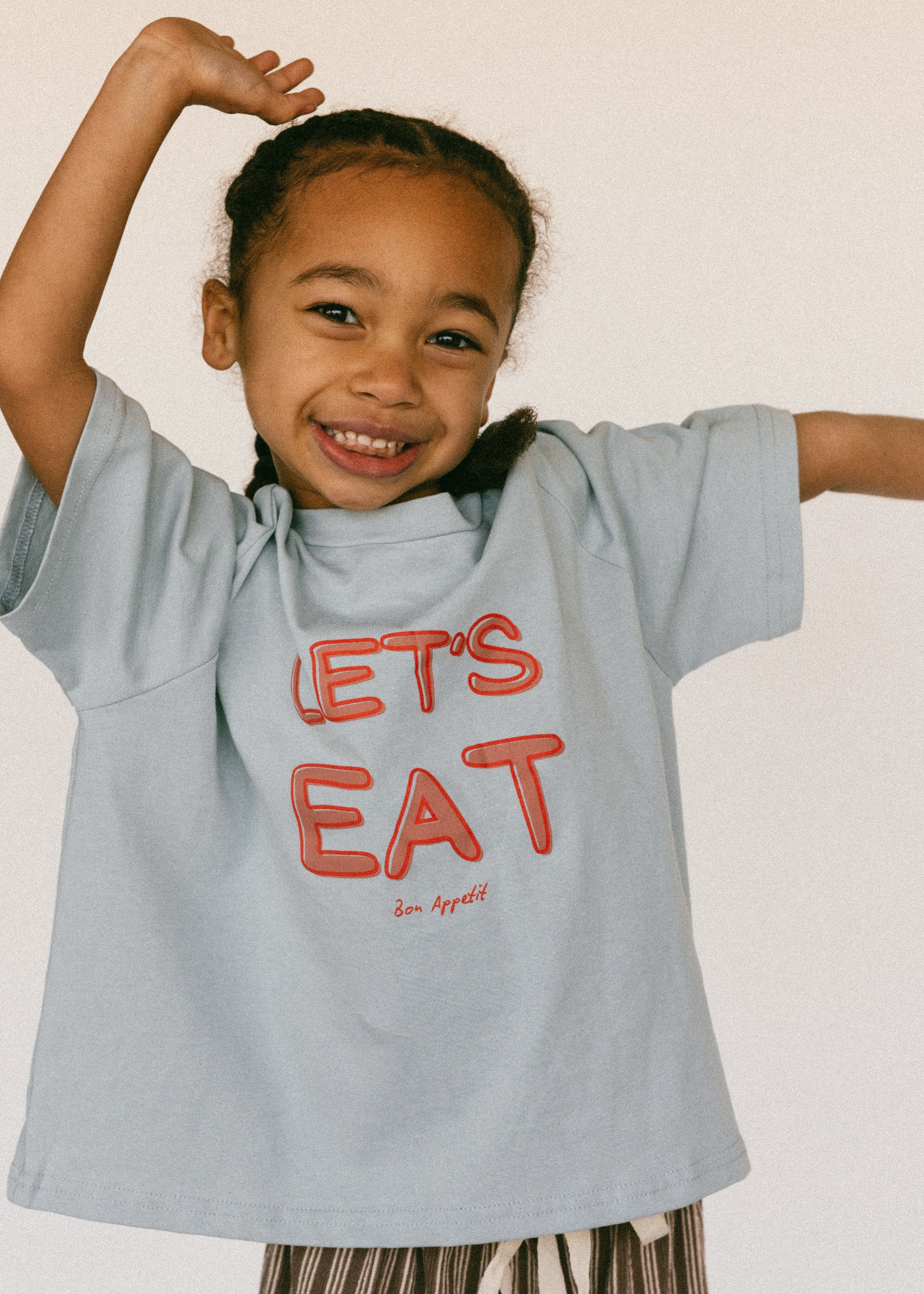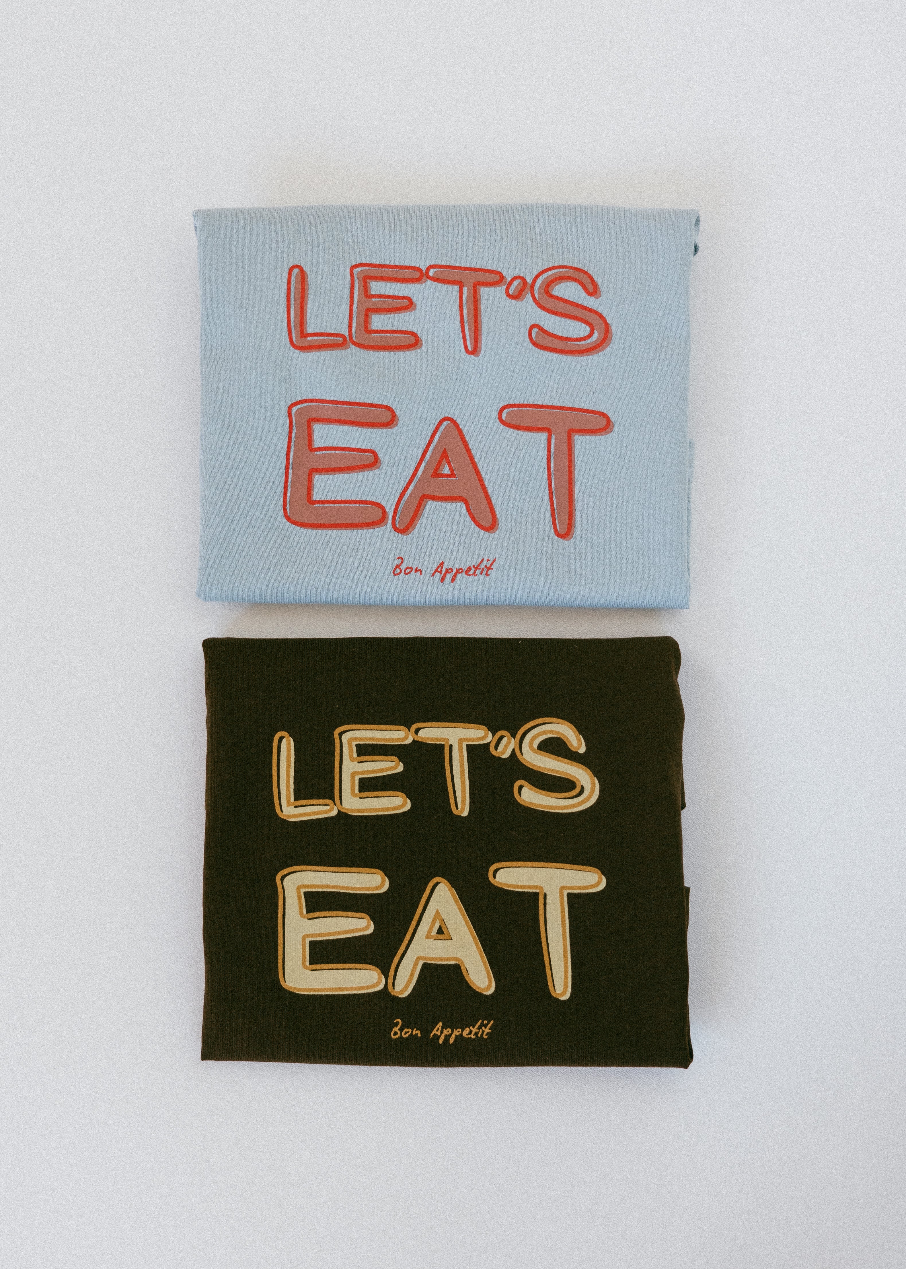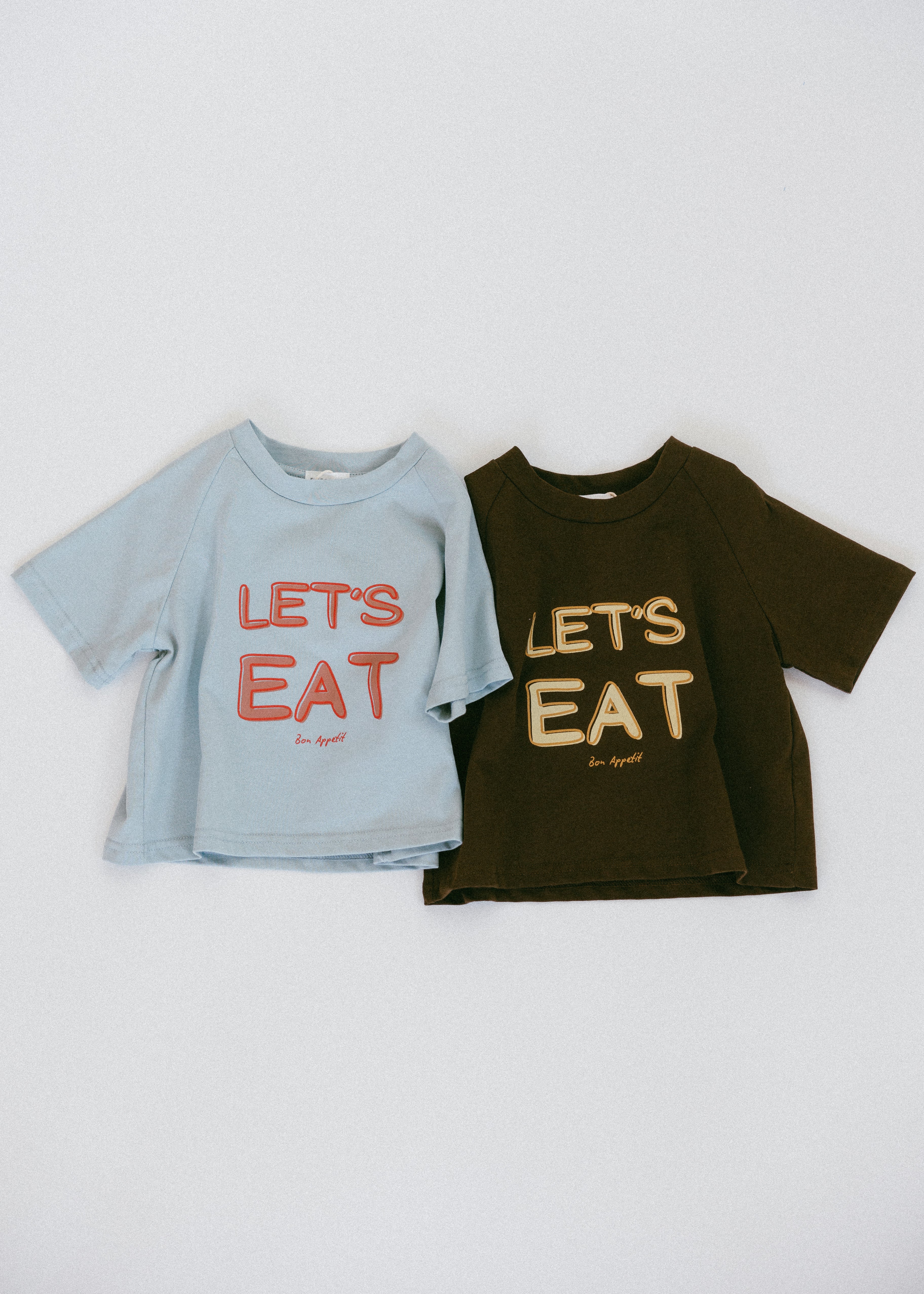 • Brown shirt with yellow lettering "Let's Eat"