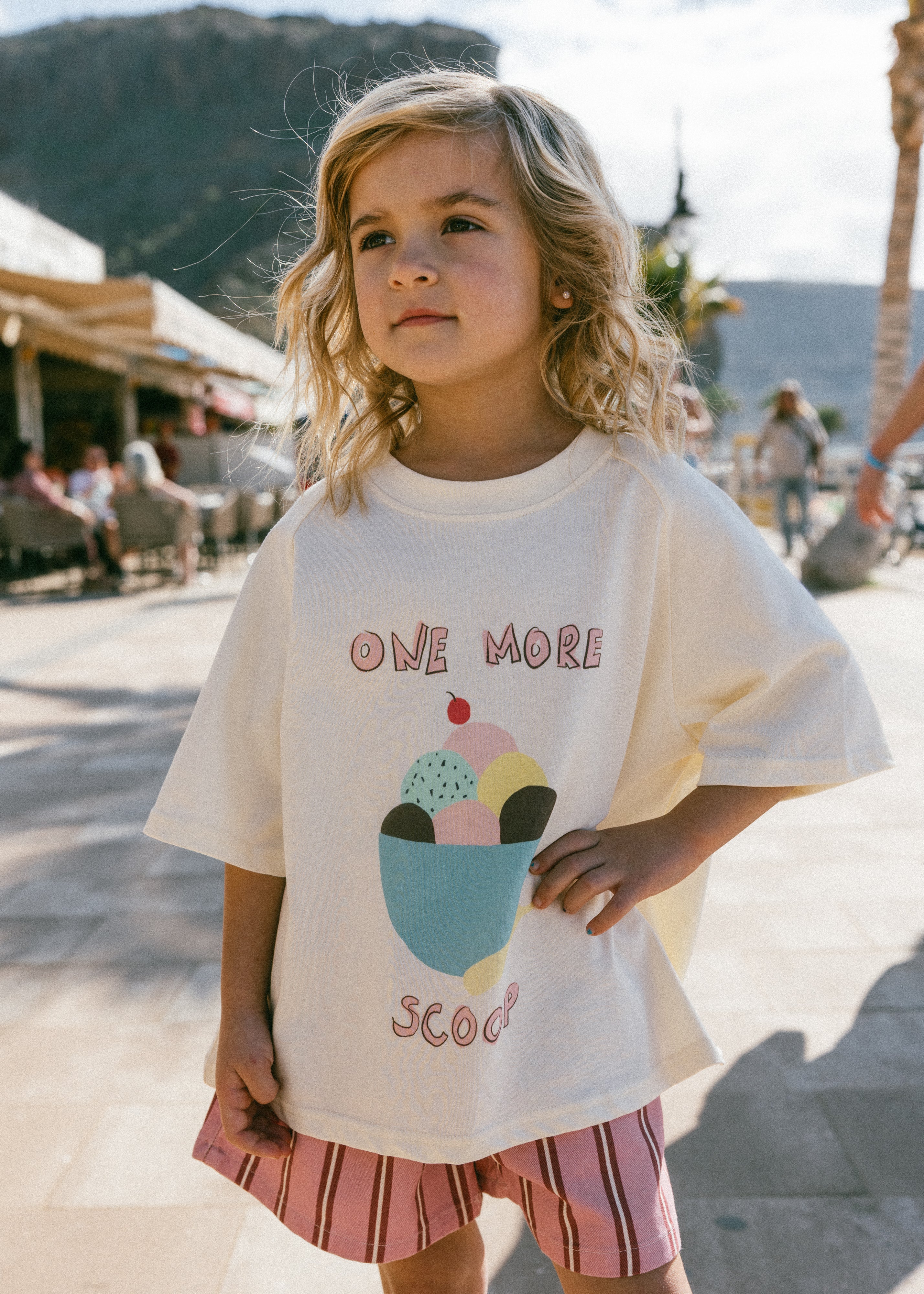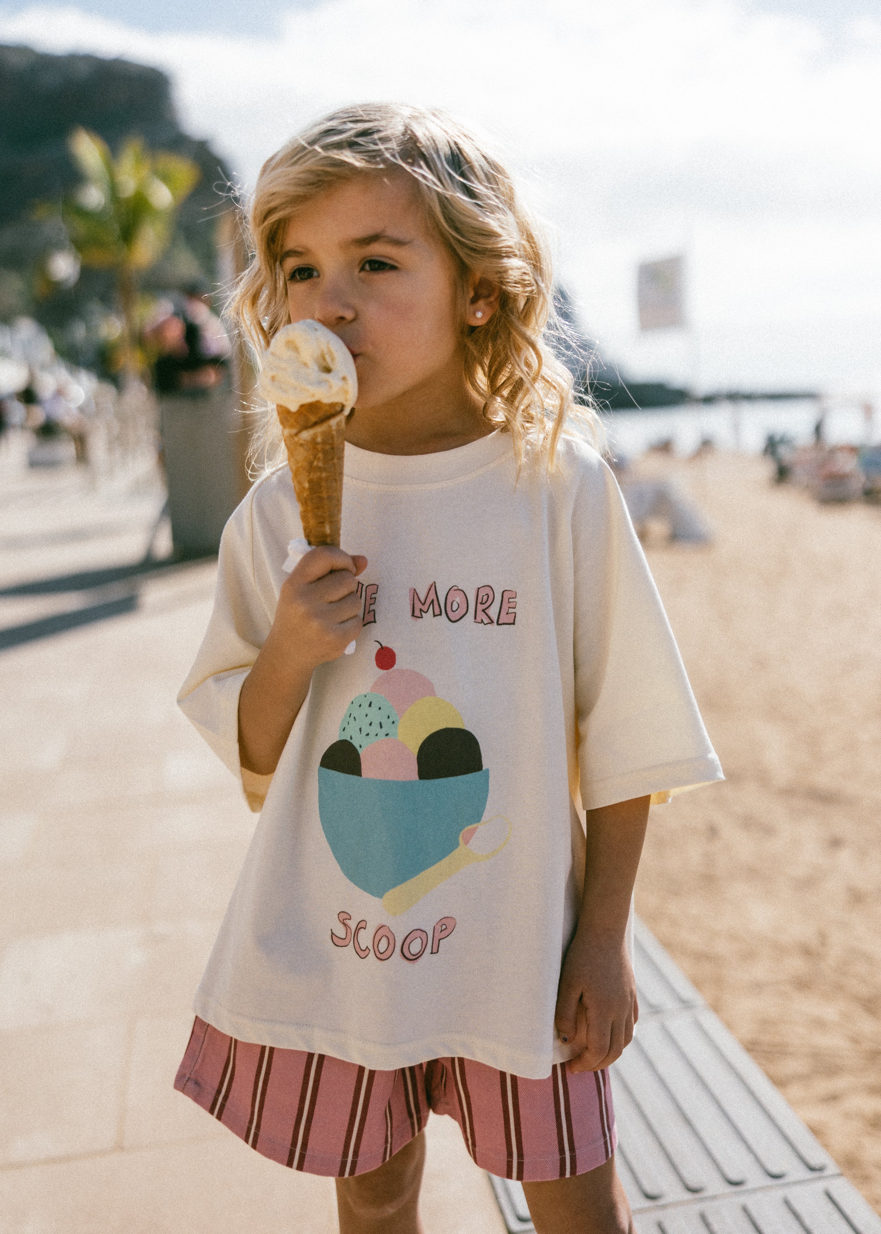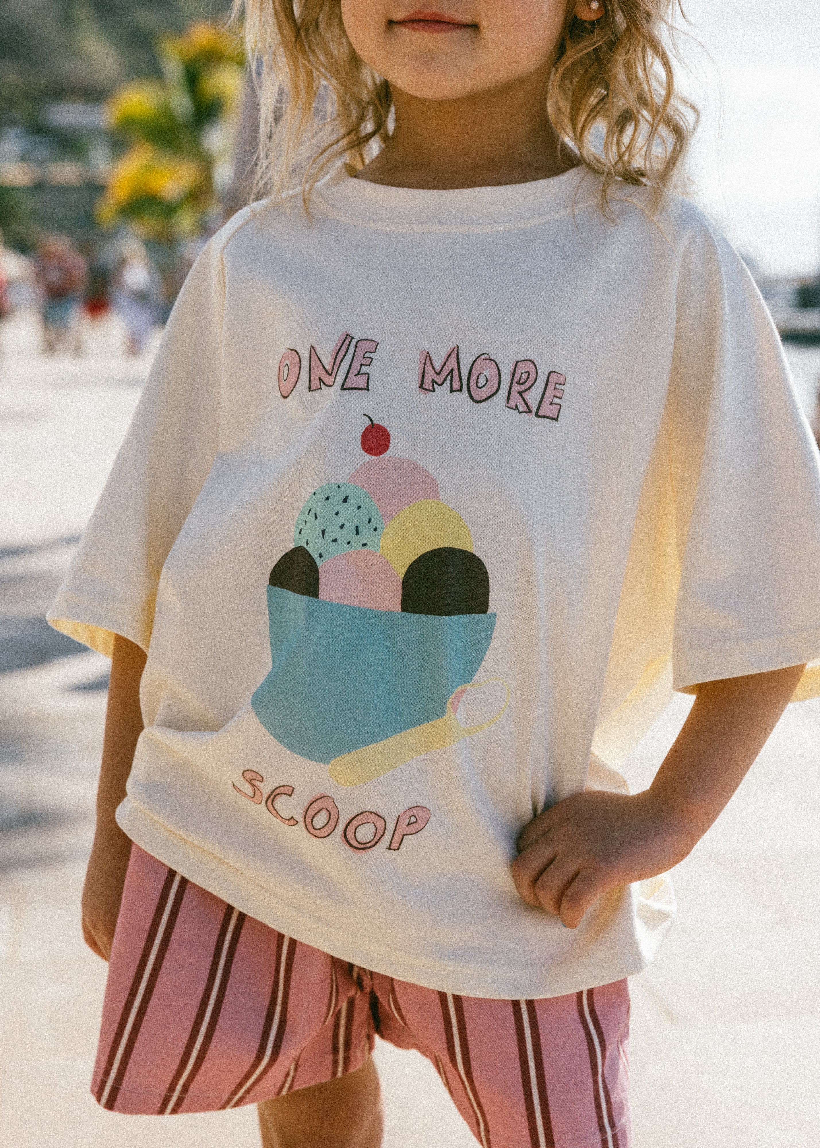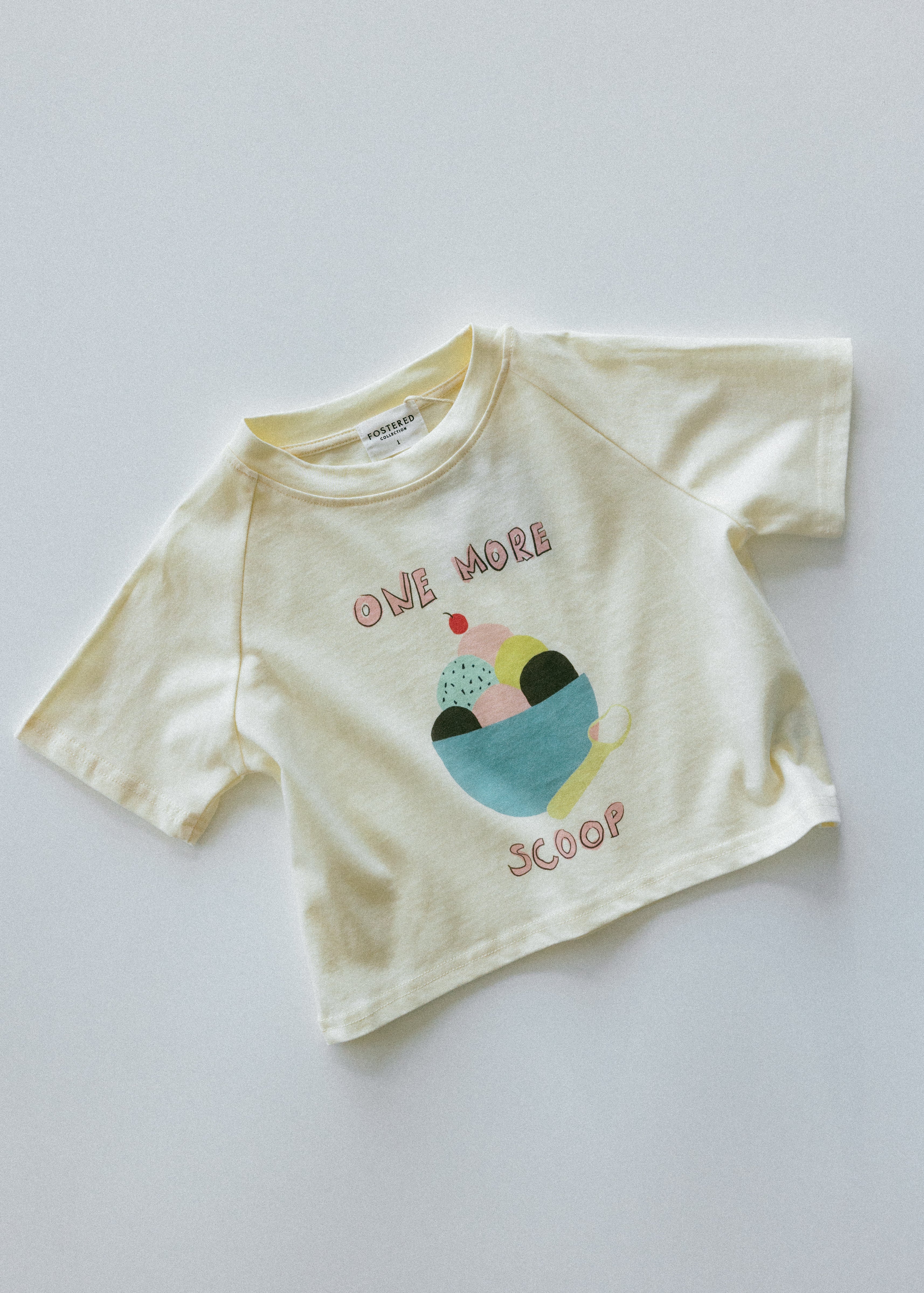 • Cream colored shirt with ice cream graphic and lettering "one more scoop"